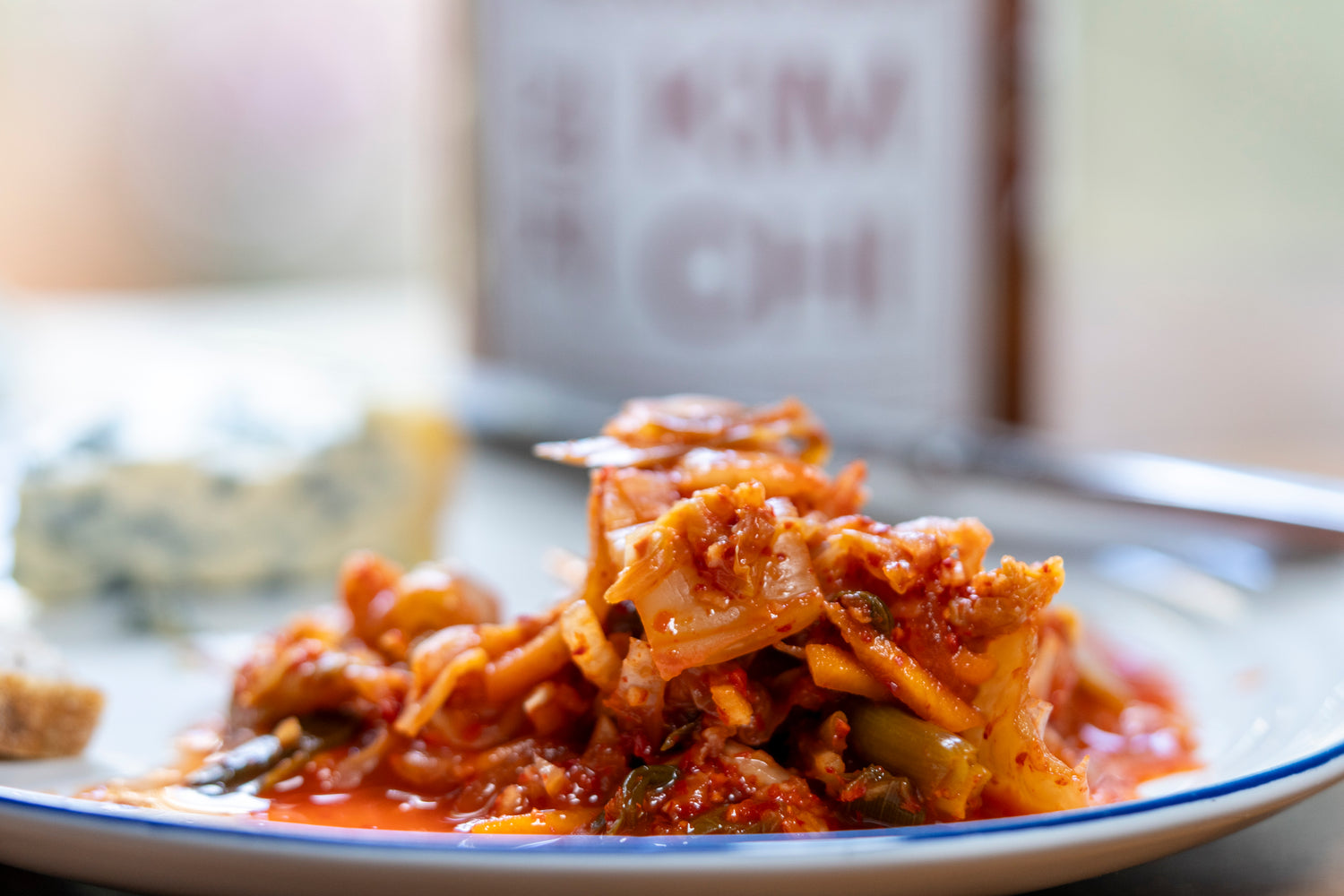 Kimchi is a traditional Korean spicy fermented vegetable dish. Whilst any number of vegetables can be made into ‘kimchi’, such as radish, kohlrabi or cucumber, the most well known is prepared using Chinese Cabbage (also known as Nappa Cabbage). The cabbage is first salted in brine, before being rinsed in fresh water and blended with various spices and other ingredients, before being fermented for anything from a few days up to many months.